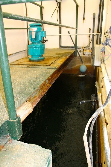 La boue est extraite et envoyée en déshydratation : l’ouverture des vannes de vidange envoie la boue vers un bassin tampon de 1000 m3. Des pompes relaient cette boue vers un épaississeur hersé (bassin avec une herse qui tourne) où est injecté un polymère qui va encore grossir le floc.